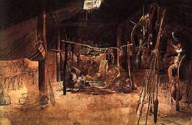 When the white men started up the rivers of the Plains, especially the Missouri, they found two types of Native American tribes. One type of tribe was the nomadic hunter-gatherers who were so focused on the buffalo (Cheyenne, Sioux, Arapahoe and many others). These were the tribes that became the focus of Hollywood westerns, the tribes that attacked wagon trains and engaged in constant ritualized warfare. Our media image of Native Americans is very much that of the Plains nomads roaming the grasslands. This is strange for two reasons, first , there were so many other interesting and more numerous tribes, from whale hunters of the northwest to acorn grinders of California to the city living farmers who inhabited Cahokia(Memo #13). The other reason is that the Plains buffalo-hunters had a very new way of life ; these tribes used the grasslands in new ways as nomads thanks to the horse which the Spanish introduced to the New World. Before 1520, when Cortes led an expedition to Mexico City, horses were unknown in North America. After that, horses spread very fast and tribes quickly became horse oriented.