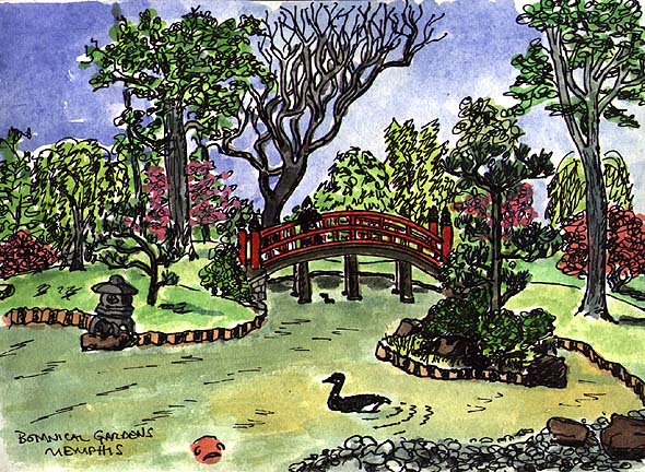 Our thought was to do some drawings. The Japanese Mediation Garden sounded likely. But it was more in the Japanese dinosaur movie genre. There was a lacquered red bridge and some stone lanterns, to be sure, and a couple of crooked pines, but the scale was all American. Nothing spoke to anything else. And the blessed geese had shat everywhere. When you approached the turbid waters edge herds of goldfish, some gigantic, congregated at your feet, as did the geese. You hesitated to get too near the edge. They looked REAL hungry. The geese honked demandingly.