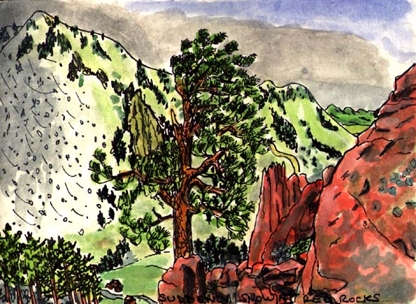 This is where the prairie smacks into upthrust crustal deformations and you begin to gasp for breath. The big mountains lump up twice as high deeper into western Colorado, but these foothills, the Frontal Range, put all our eastern bumps to shame. The prevailing shade of rock is a burnt purple sienna, fuzzed with the green of pines, now dusted with white. Outcrops of tilted strata in hot red and sour blue-green punctuate the scene.